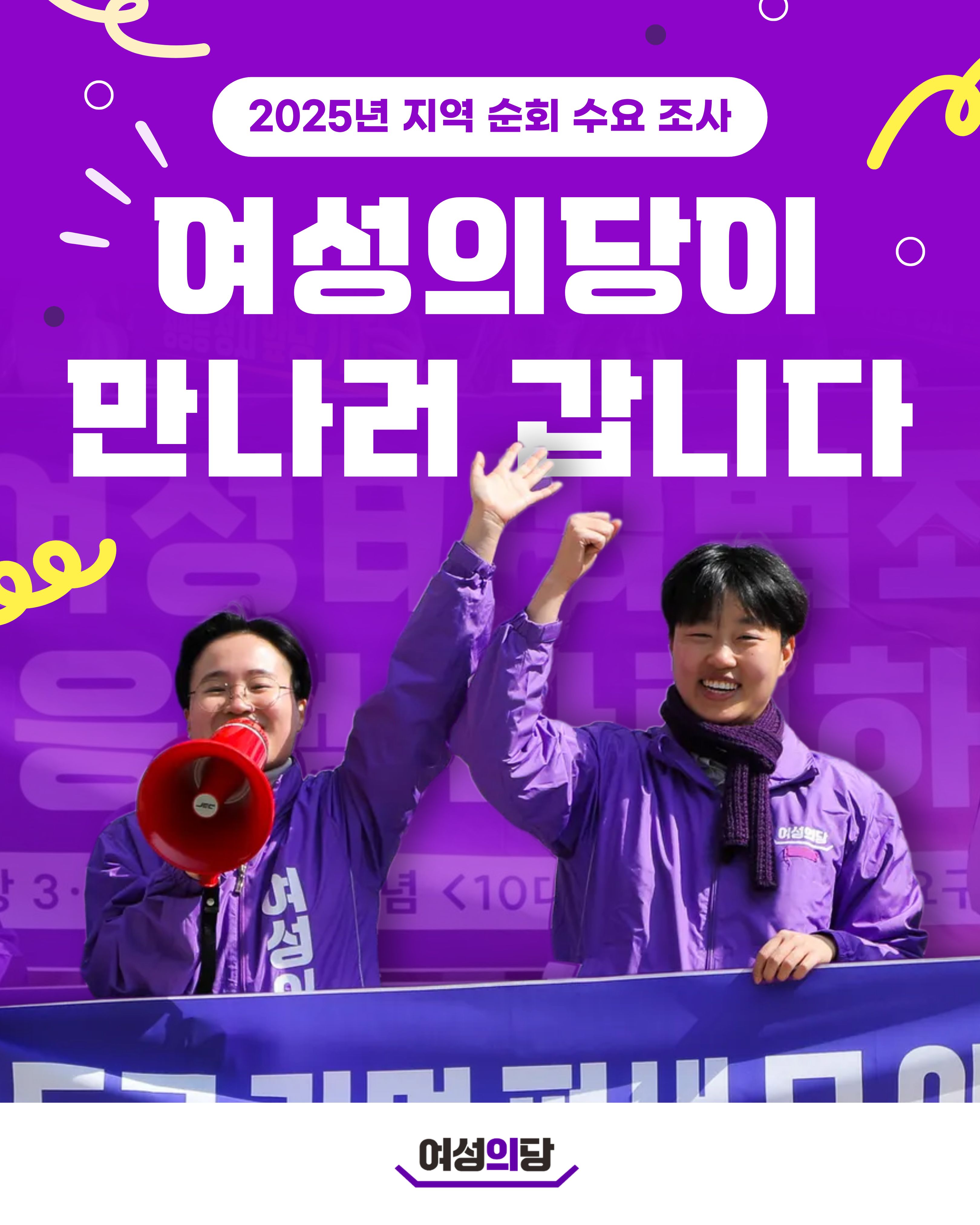 ![]() 여성의당이 당원 여러분을 만나러 갑니다! 여성의당은 올해 11월과 12월에 걸쳐, 전국 각지에 계신 당원 여러분을 직접 찾아뵙고 그간의 활동을 소개드리고자 합니다. 우리 지역에 여성의당이 찾아오기를 희망하시는 당원분들께서는 아래 링크를 통해 수요조사에 참여해주시기를 바랍니다. 조사 결과 당원분들의 수요가 가장 높은 지역 몇 군데를 선정해 지역 순회 행사가 개최될 예정입니다. 당원 여러분의 많은 관심과 참여 부탁드립니다. [2025년 여성의당 지역 순회 수요조사] 기간: 9/25(목)~9/28(일) *본 수요조사는 지역 순회 행사 참석을 희망하는 당원을 대상으로 진행됩니다. |