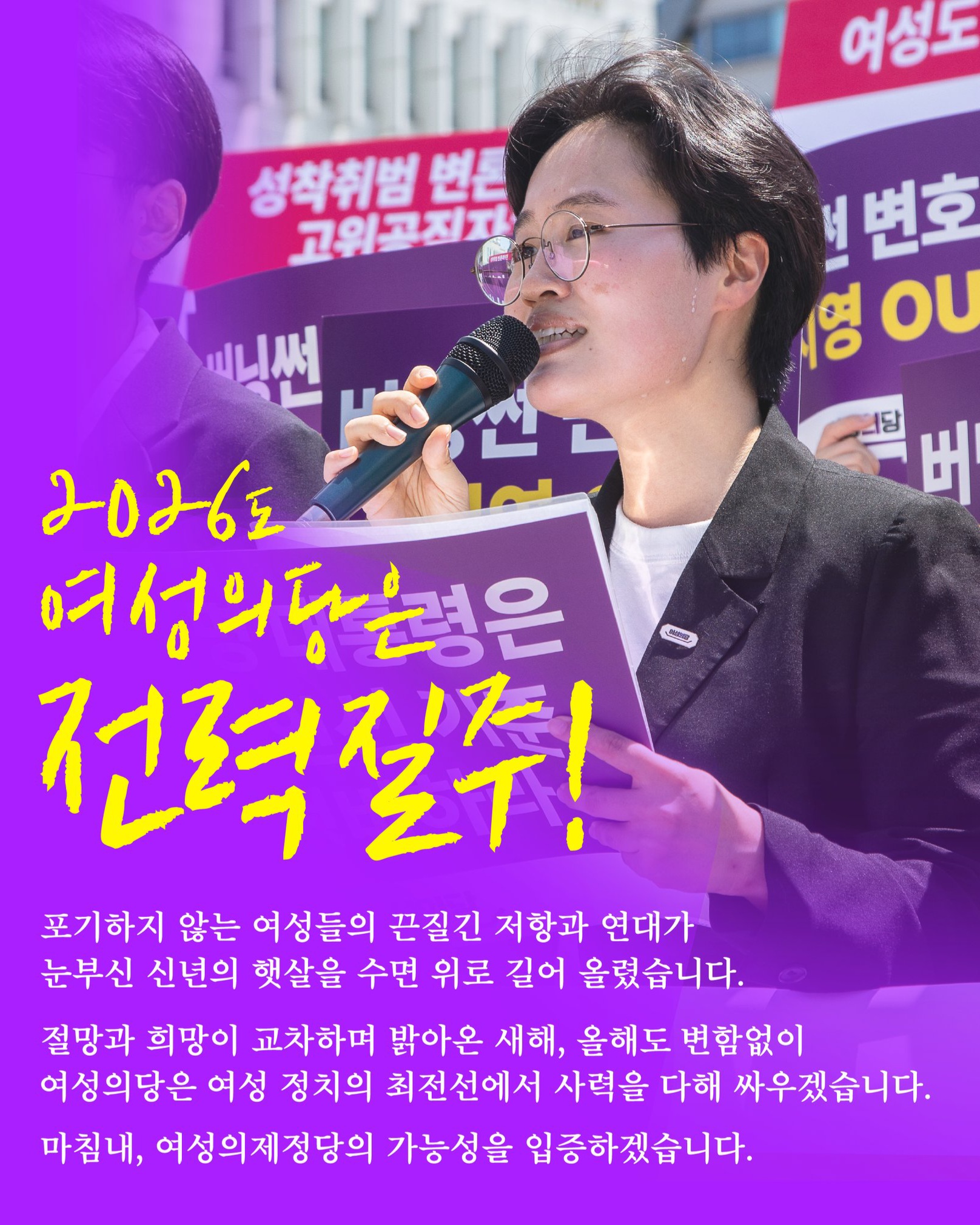 | 올해도 변함없이 여성의당은 여성 정치의 최전선에서 사력을 다해 싸우겠습니다 | |