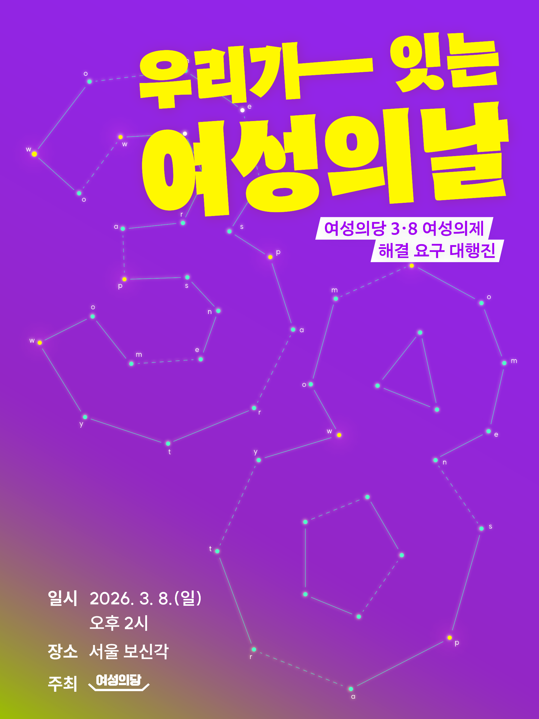정부의 역차별 정책 기조에 분노하고, 여성의제 해결을 요구하고자 ‘우리가 잇는 여성의날: 여성의당 3·8 여성의제 해결 요구 대행진’을 진행합니다. 세계 여성의 날이자 여성의당 창당 6주년인 3월 8일, 보신각에 모여주십시오.