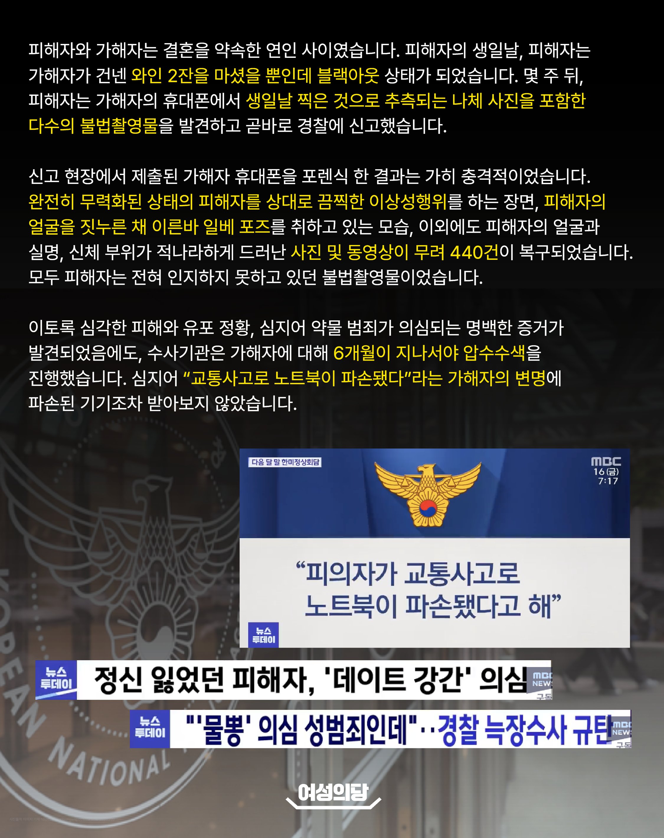 2020년, 한 여성이 결혼을 약속했던 남자친구에게 약물 성범죄를 당했습니다. 남자친구의 휴대폰에는 440건의 불법촬영물이 담겨 있었습니다. 영상과 사진에는 피해자의 얼굴과 이름, 신체 부위가 적나라하게 드러났고 가해자는 피해자의 얼굴을 짓누르며 "일베 포즈"를 취했습니다. 심지어 불법촬영물을 각종 SNS와 성착취물이 유포되는 도박 사이트에 유포했습니다. 그러나 경찰은 6개월이 지나도록 압수수색마저 제대로 진행하지 않았습니다.