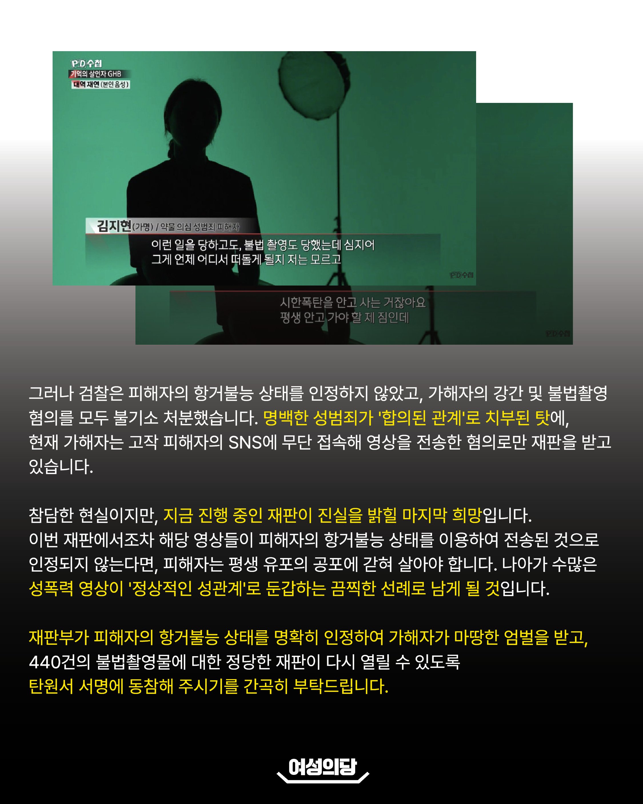 재판부가 피해자의 항거불능 상태를 명확히 인정하여 가해자가 마땅한 엄벌을 받고, 440건의 불법촬영물에 대한 정당한 재판이 다시 열릴 수 있도록 탄원서 서명에 동참해 주시기를 간곡히 부탁드립니다.