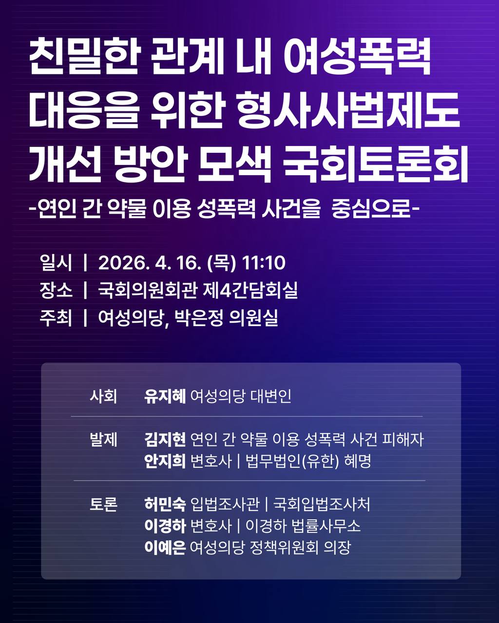 | 친밀한 관계 내 여성폭력 대응을 위한 형사사법제도 개선 방안 모색 국회 토론회 | |