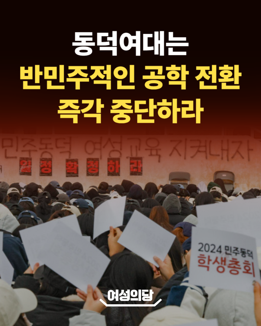 ![]() [논평] 동덕여대는 반민주적인 공학 전환 즉각 중단하라 동덕여자대학교가 2029년 공학 전환 입장을 발표했다. 이는 학생들의 의사를 철저히 배제한 채 강행된 명백한 폭거다. 대학 본부가 내세운 온갖 숙의기구와 과정은 민주적 절차를 가장한 기만적인 요식 행위에 불과했음이 여실히 드러났고, 지난 1년여간 터져 나온 학생들의 절박한 반대 외침은 철저히 묵살당했다. 온 사회가 작년 12·3 계엄 사태를 딛고 민주주의의 가치를 재확인하는 시국에, 동덕여대 본부만이 학생들의 입을 막고 구시대적인 불통 행정을 답습하고 있다. 사학비리와 족벌 경영으로 얼룩진 적폐와 학생 교육권마저 방치해 온 무능함을 가리기 위해, 불법적인 수단까지 동원해 학생들의 의사를 짓밟는 행위는 그 어떤 명분으로도 정당화될 수 없다. 교육부는 언제까지 '대학운영의 자율성 보장'을 방패 삼아 사립재단의 적폐와 반민주적인 경영을 방치할 셈인가? 교육 당국은 즉각적인 관리·감독에 나서 이번 사태에 무거운 책임을 다해야 할 것이다. 무엇보다 학생 여론을 묵살한 채 졸속으로 추진된 공학 전환 관련 정관 변경을 결코 승인해서는 안 된다. 여성의당은 반민주적인 공학 전환을 강행한 동덕여대 대학본부의 결정을 강력히 규탄하며, 민주적인 대학을 되찾기 위한 정당한 싸움을 이어가는 학생들의 편에 서겠다. 2025. 12. 3. |