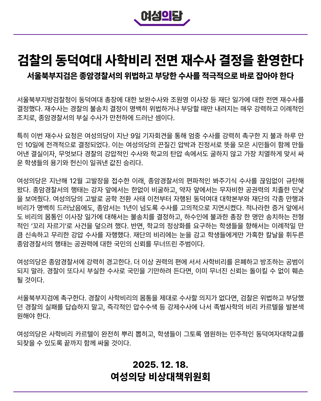 ![]() [성명] 검찰의 동덕여대 사학비리 전면 재수사 결정을 환영한다. 서울북부지검은 종암경찰서의 위법하고 부당한 수사를 적극적으로 바로 잡아야 한다. 서울북부지방검찰청이 동덕여대 총장에 대한 보완수사와 조원영 이사장 등 재단 일가에 대한 전면 재수사를 결정했다. 재수사는 경찰의 불송치 결정이 명백히 위법하거나 부당할 때만 내려지는 매우 강력하고 이례적인 조치로, 종암경찰서의 부실 수사가 만천하에 드러난 셈이다. 특히 이번 재수사 요청은 여성의당이 지난 9일 기자회견을 통해 엄중 수사를 강력히 촉구한 지 불과 하루 만인 10일에 전격적으로 결정되었다. 이는 여성의당의 끈질긴 압박과 진정서로 뜻을 모은 시민들이 함께 만들어낸 결실이자, 무엇보다 경찰의 강압적인 수사와 학교의 탄압 속에서도 굴하지 않고 가장 치열하게 맞서 싸운 학생들의 용기와 헌신이 일궈낸 값진 승리다. 여성의당은 지난해 12월 고발장을 접수한 이래, 종암경찰서의 편파적인 봐주기식 수사를 끊임없이 규탄해 왔다. 종암경찰서의 행태는 강자 앞에서는 한없이 비굴하고, 약자 앞에서는 무자비한 공권력의 치졸한 민낯을 보여줬다. 여성의당의 고발로 공학 전환 사태 이전부터 자행된 동덕여대 대학본부와 재단의 각종 만행과 비리가 명백히 드러났음에도, 종암서는 1년이 넘도록 수사를 고의적으로 지연시켰다. 적나라한 증거 앞에서도 비리의 몸통인 이사장 일가에 대해서는 불송치를 결정하고, 하수인에 불과한 총장 한 명만 송치하는 전형적인 ‘꼬리 자르기’로 사건을 덮으려 했다. 반면, 학교의 정상화를 요구하는 학생들을 향해서는 이례적일 만큼 신속하고 무리한 강압 수사를 자행했다. 재단의 비리에는 눈을 감고 학생들에게만 가혹한 칼날을 휘두른 종암경찰서의 행태는 공권력에 대한 국민의 신뢰를 무너뜨린 주범이다. 여성의당은 종암경찰서에 강력히 경고한다. 더 이상 권력의 편에 서서 사학비리를 은폐하고 방조하는 공범이 되지 말라. 경찰이 또다시 부실한 수사로 국민을 기만하려 든다면, 이미 무너진 신뢰는 돌이킬 수 없이 훼손될 것이다. 서울북부지검에 촉구한다. 경찰이 사학비리의 몸통을 제대로 수사할 의지가 없다면, 검찰은 위법하고 부당했던 경찰의 실패를 답습하지 말고, 즉각적인 압수수색 등 강제수사에 나서 족벌사학의 비리 카르텔을 발본색원해야 한다. 여성의당은 사학비리 카르텔이 완전히 뿌리 뽑히고, 학생들이 그토록 염원하는 민주적인 동덕여자대학교를 되찾을 수 있도록 끝까지 함께 싸울 것이다. 2025. 12. 18. |