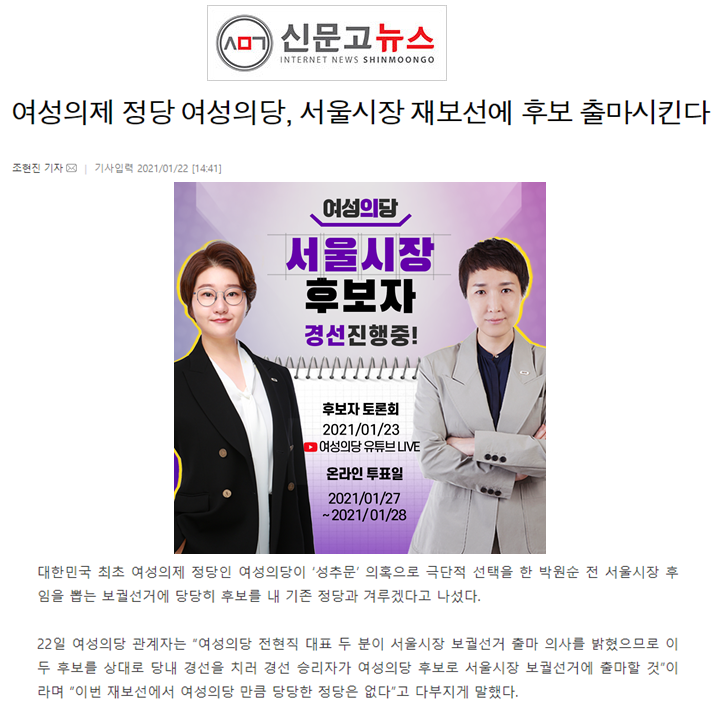 [신문고뉴스] 여성의제 정당 여성의당, 서울시장 재보선에 후보 출마시킨다