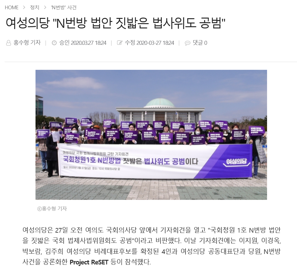 2020.03.27 여성신문> 정치 > ‘N번방’ 사건 여성의당 "N번방 법안 짓밟은 법사위도 공범" http://www.womennews.co.kr/news/articleView.html?idxno=197632