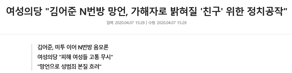 2020.04.07 > 한국경제 > 정치 > 여성의당 "김어준 N번방 망언, 가해자로 밝혀질 '친구' 위한 정치공작“