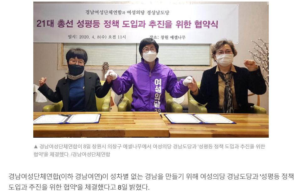 2020.04.09 > 경남도민일보 > 사회 > 인권·복지 > 경남여연-여성의당 경남도당 성평등 협약 http://www.idomin.com/news/articleView.html?idxno=726603