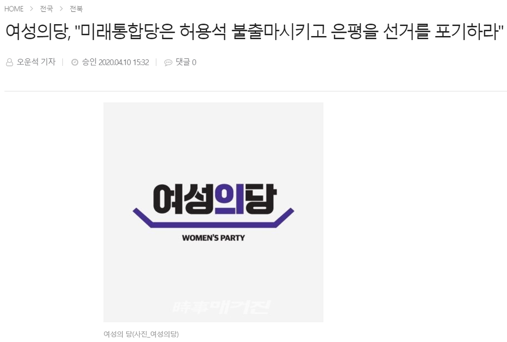 | [시사매거진]여성의당, "미래통합당은 허용석 불출마시키고 은평을 선거를 포기하라" | |