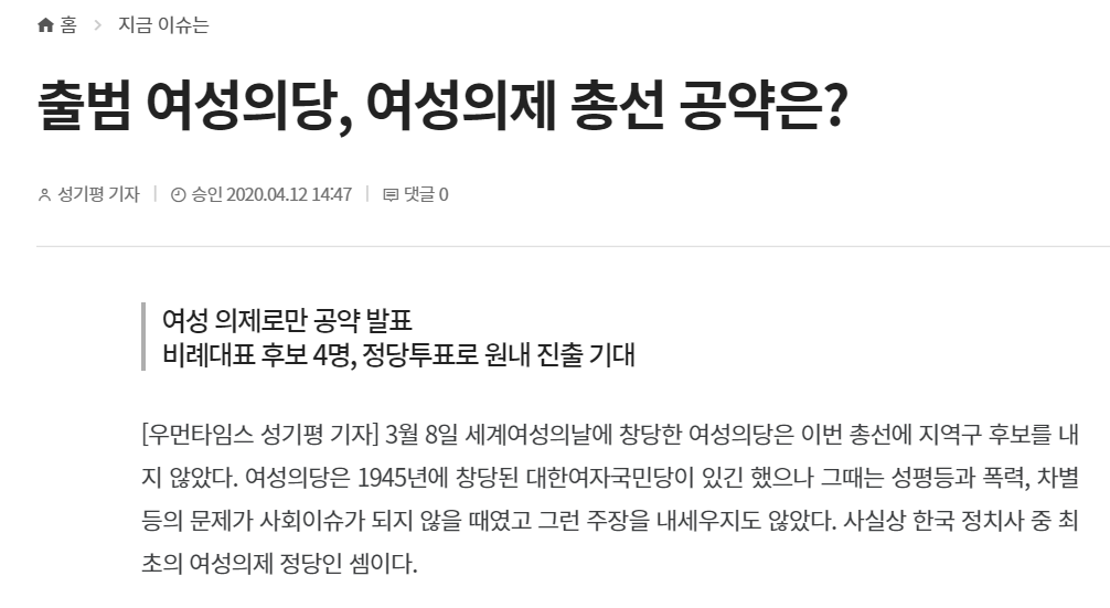2020.04.12 > 우먼타임스 > 지금 이슈는 > 출범 여성의당, 여성의제 총선 공약은?
