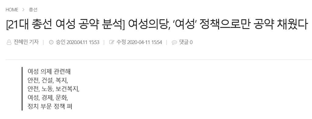| [여성신문][21대 총선 여성 공약 분석] 여성의당, ‘여성’ 정책으로만 공약 채웠다 | |