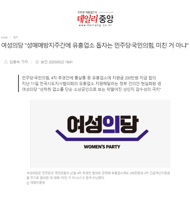 [데일리중앙] 여성의당 "성매매방지주간에 유흥업소 돕자는 민주당·국민의힘, 미친 거 아냐"