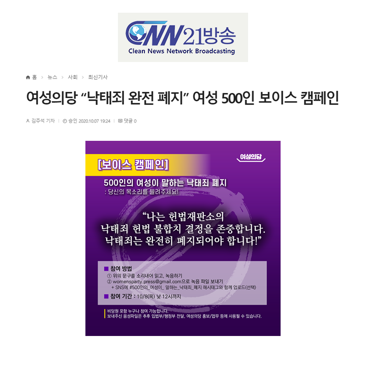 | [CNN21방송] 여성의당 “낙태죄 완전 폐지” 여성 500인 보이스 캠페인 | |
