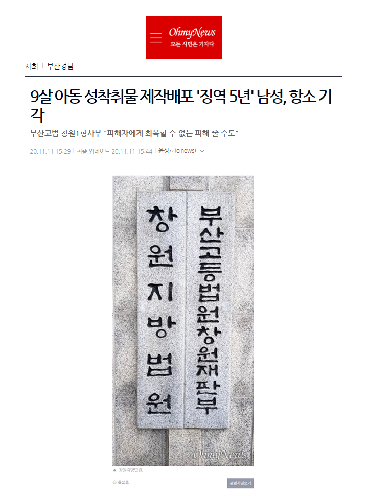 | [오마이뉴스] 9살 아동 성착취물 제작배포 '징역 5년' 남성, 항소 기각 | |