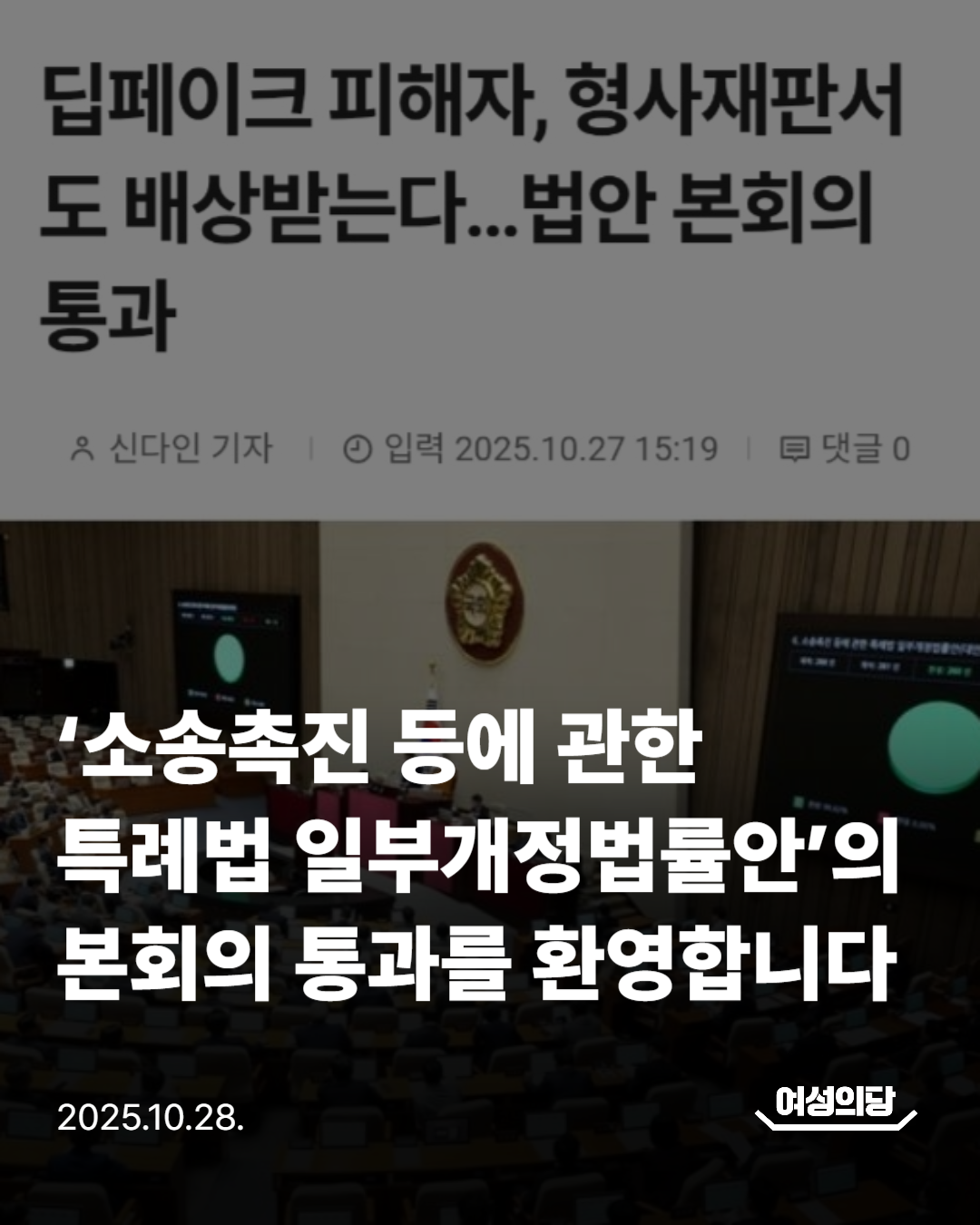![]() ‘소송촉진 등에 관한 특례법 일부개정법률안’의 국회 본회의 통과를 환영합니다. 이번 개정안 통과로, 딥페이크 등 디지털 성범죄 피해자가 형사재판 절차만으로도 가해자에게 손해배상을 청구할 길이 열렸습니다. 법원이 형사 유죄 판결과 동시에 범죄로 인한 재산적 손해나 치료비 등 민사 배상을 명령할 수 있게 된 것입니다. 이는 피해자가 별도의 민사소송을 제기해야 했던 비용과 시간, 정신적 부담을 덜어주는 의미 있는 진전입니다. 그러나 형사배상 제도의 범위가 확대되었다고 해서 곧바로 피해자의 권리가 온전히 보장되는 것은 아닙니다. 현실의 법정에서는 여전히 성폭력 사건에서 배상명령이 인정되는 사례가 극히 드물고, 성범죄 가해자에게 관대한 판결이 반복되고 있습니다. 따라서 법과 제도가 실질적으로 피해자를 보호하고, 진정한 사법정의를 구현할 수 있도록 지속적인 감시와 압박이 요구됩니다. 박은정 조국혁신당 의원이 발의한 이번 법안은, 전 법무부 디지털성범죄 등 대응 TF를 통해 권고된 법안이기도 합니다. 당시 현장에서 치열하게 노력하신 서지현 전 검사님을 비롯한 리셋(ReSET), 추적단 불꽃 등 TF 구성원분들께 깊은 존경과 감사를 드립니다. 더불어, 긴 시간 고통 속에서도 용기를 잃지 않고 싸움을 이어온 피해생존자분들께 진심 어린 연대의 마음을 전합니다. 플랫폼 사업자 책임 확대, 불법 촬영물 삭제 지원 강화 등을 포함한 나머지 '딥페이크 차단 6법' 또한 조속히 통과되길 간절히 소망합니다. 오늘의 진전이 피해자들에게 내일을 이어가는 힘이 될 수 있도록, 여성의당 또한 디지털 성범죄 근절을 위한 싸움을 끝까지 이어가겠습니다. |