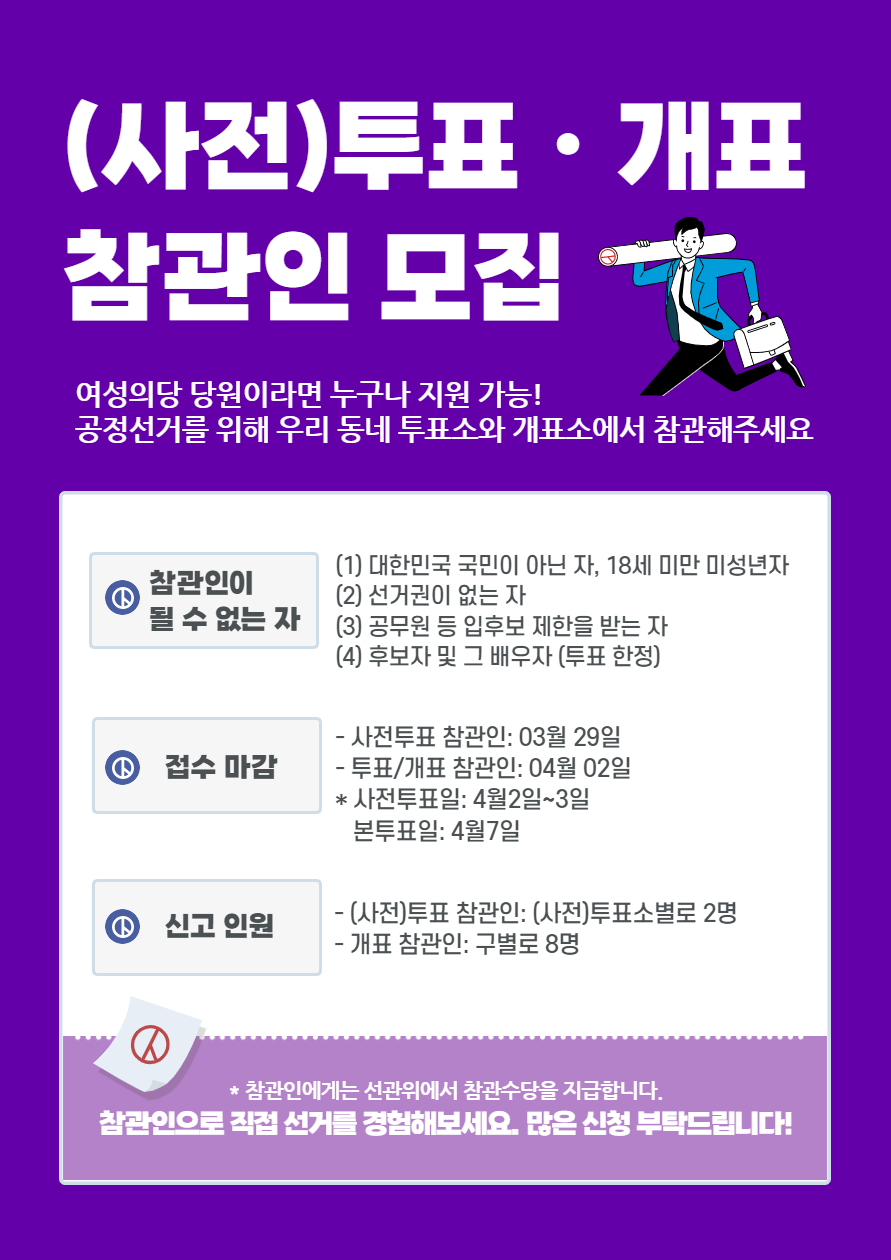 안녕하세요, 당원 여러분. (사전) 투표·개표 참관인을 모집합니다. 하단 첨부한 사진과 공지 확인해주시고, 많은 참여와 신청 바랍니다.