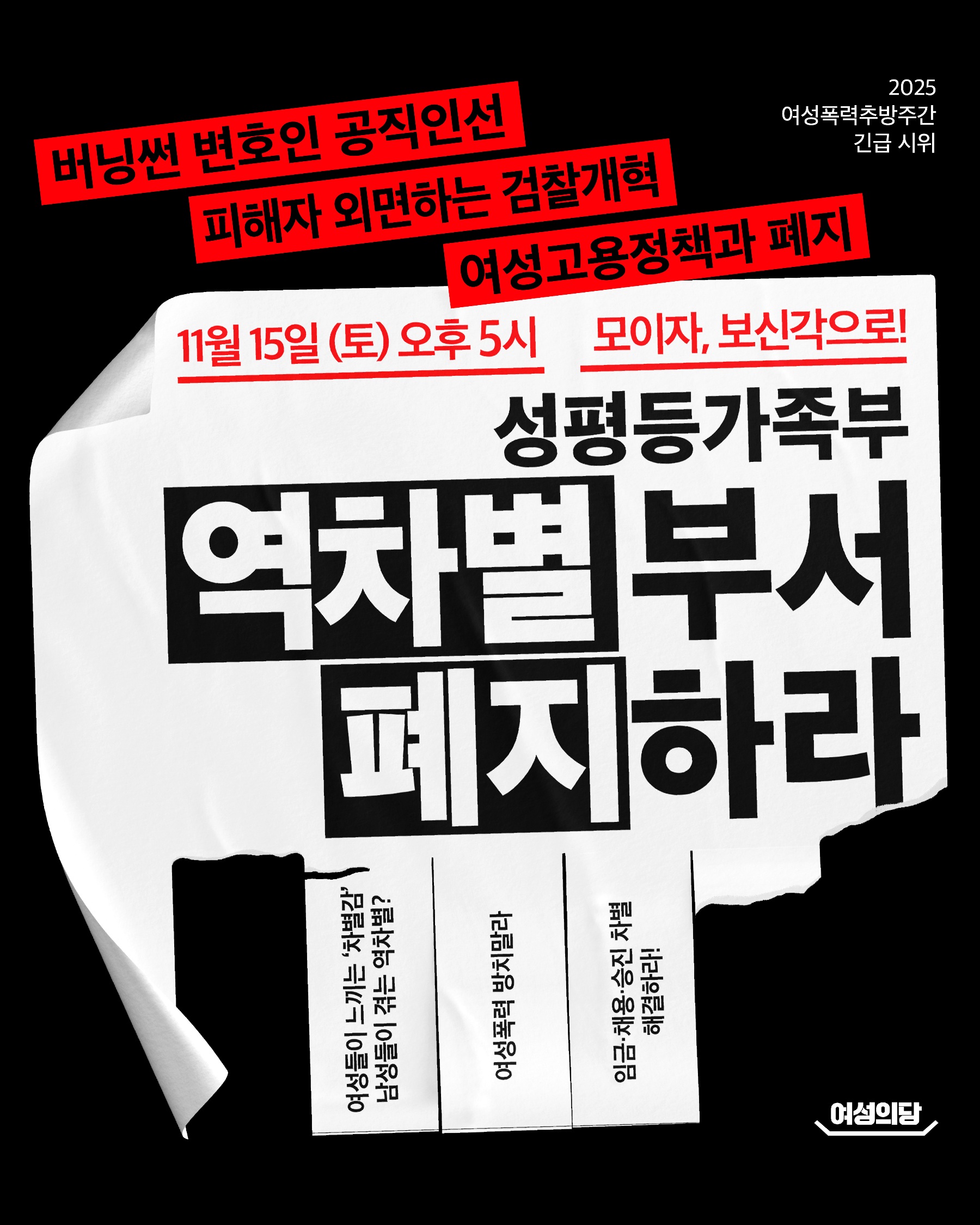 ![]() 버닝썬 변호인은 공직에, 여성폭력은 방치, 여가부는 폐지? ■일시: 11월 15일 (토) 오후 5시 현 정부는 여성가족부를 성평등가족부로 개편해 "성평등을 실현하겠다"고 약속했습니다. 하지만 새 부처는 오히려 '남성 역차별 해소'라는 허구의 담론을 내세워 여성정책을 후퇴시키고 있습니다. 여성정책과가 남성 역차별 해소를 담당하는 '성형평성기획과'에 밀려났고, 부처의 이름에서조차 ‘여성’이라는 단어가 완전히 사라졌습니다. 정부가 폐지해야 할 것은 여성 관련 부처가 아니라 매일 기사 헤드라인을 채우는 여성폭력, 야동코리아를 포함해 난립하는 불법 성착취물 사이트, OECD 최고 수준의 성별 임금격차입니다. 이재명 정부는 여성폭력 문제를 해결하겠다면서도 의도적으로 여성의 목소리를 지우고 있습니다. 더 이상 지켜볼 수 없습니다. 여성을 지우고, 여성을 향한 폭력과 차별을 방관하는 행태에 맞서 목소리를 높여야 합니다. 여성의당은 시민들과 함께 여성을 지우는 무책임한 정치에 경고를 보내고자 합니다. 11월 15일, 성평등가족부의 역차별 부서 폐지를 촉구하고, 정부의 여성 배제적인 국정 운영을 규탄하는 자리에 함께해 주십시오. |