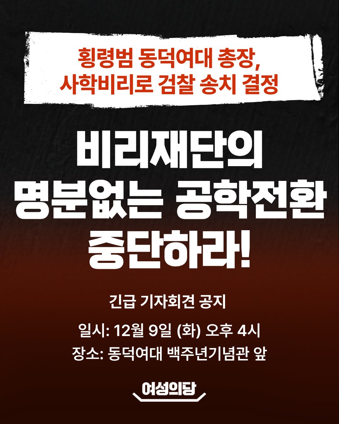 | [긴급 기자회견] 등록금 횡령한 동덕여대 총장 송치! 비리재단의 명분 없는 공학전환 중단하라 | |