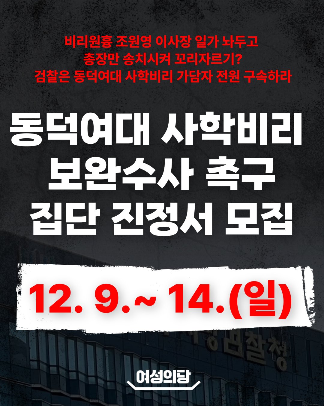 이에 여성의당은 조원영 동덕학원 이사장과 그 일가에 대한 전면적인 보완수사를 통해 진실을 밝혀낼 것을 강력히 촉구합니다. 총장의 횡령 혐의가 인정되었다면, 그 돈이 누구를 위해 쓰였는지, 그로 인해 누가 실질적인 이득을 보았는지 끝까지 추적해야 마땅합니다. 서울북부지검의 강력한 의지만이 수십 년간 사유재산처럼 학교를 유용해 온 족벌사학의 카르텔을 끊어낼 수 있습니다.