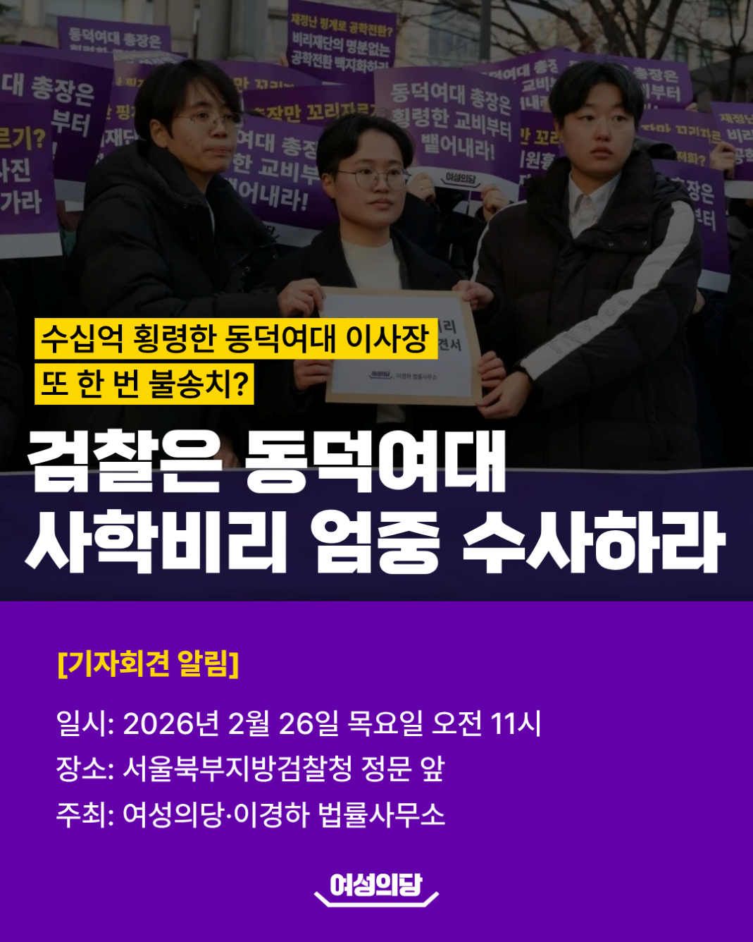 ![]() [기자회견 알림] 수십억 횡령한 동덕여대 이사장 또 한 번 불송치? 검찰은 동덕여대 사학비리 엄중 수사하라 ■일시: 2/26(목) 오전 11시 지난 12월, 검찰은 동덕여대 사학비리 사건의 전면 재수사를 경찰에 요청했습니다. 수많은 시민이 분노했던 종암경찰서의 고의적인 수사 지연과 노골적인 꼬리자르기에 경고를 보낸 것입니다. 그러나 경찰은 또 한 번 사안을 졸속으로 처리했습니다. 재수사 이후에도 결국 총장만을 송치했고, 각종 사학비리의 중심에 있던 조원영 동덕재단 이사장은 또 한 번 불송치로 풀려났습니다. 이제 검찰이 직접 나서야 합니다. 북부지검은 비리재단의 횡포를 명백히 밝히고, 각종 불법행위를 엄중히 수사해 경찰의 졸속수사를 바로잡아야 합니다. 수십억대 횡령과 각종 비리를 덮기 위해, 이에 저항한 학생들의 시위를 탄압하고, 등록금으로 학생을 고소한 사학재단의 범죄를 철저히 수사해 기울어진 정의를 바로 세우십시오. 여성의당과 이경하법률사무소는 서울북부지검 앞에서 동덕여대 사학비리에 대한 엄중한 수사를 촉구할 예정입니다. 비리재단의 폭주를 막고, 동덕여대 학내 민주주의를 바로잡을 수 있도록 많은 관심과 참석 부탁드립니다. |