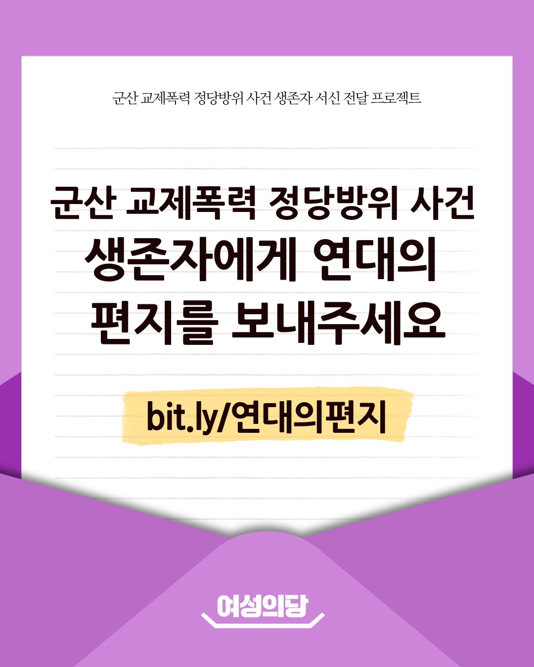 ![]() 군산 교제폭력 정당방위 사건 생존자가 삶의 의욕을 찾을 수 있도록, 연대의 메시지를 보내주세요! |