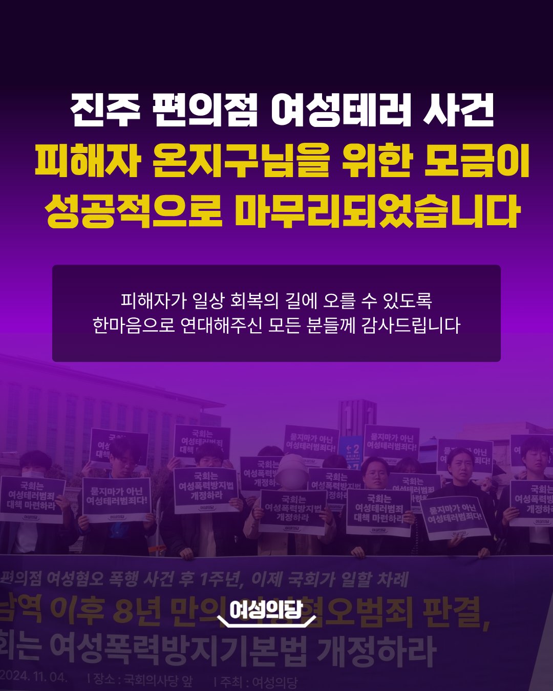 | 진주 편의점 여성테러 사건 피해자 온지구님을 위한 모금이 성공적으로 마무리되었습니다 | |