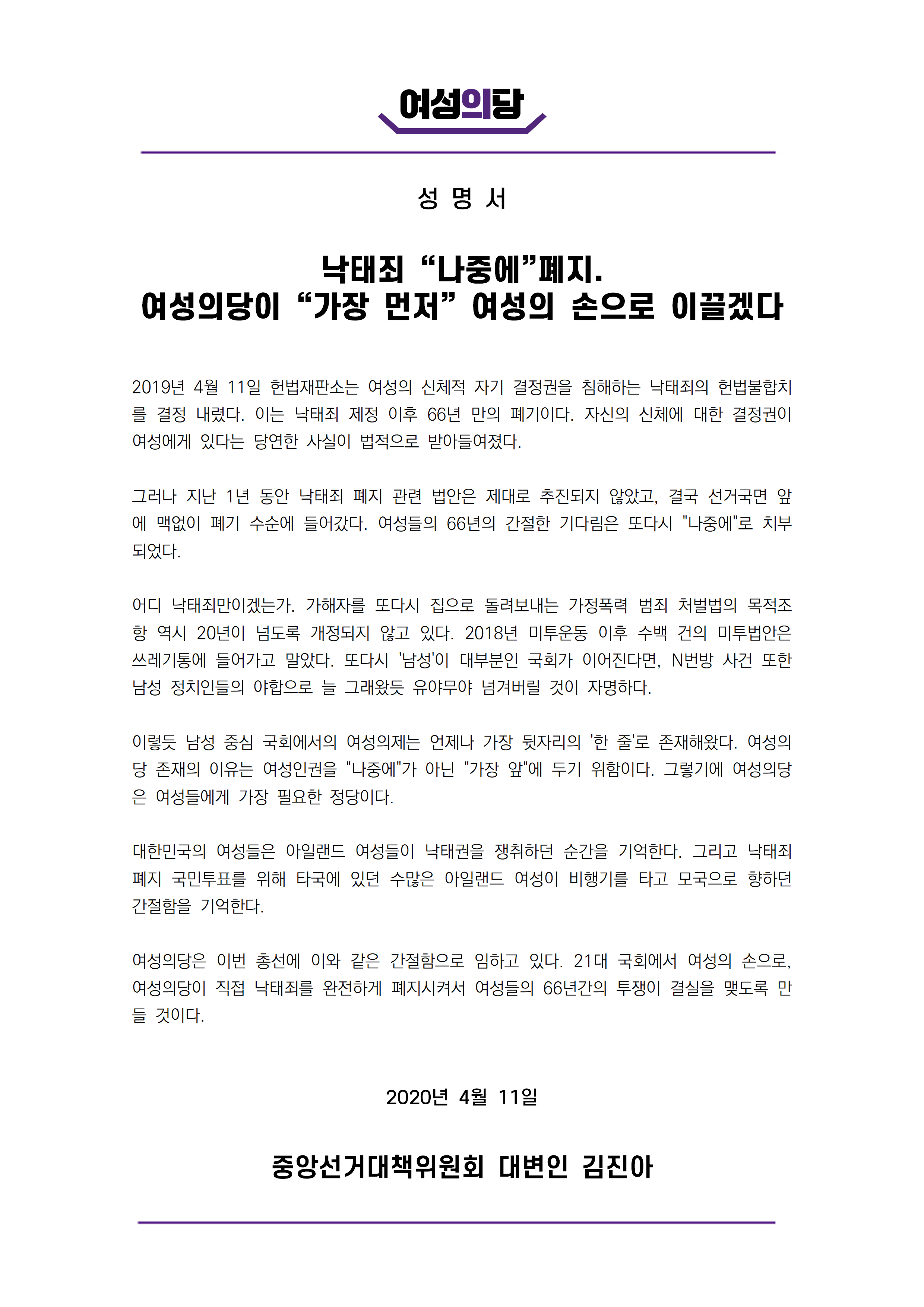 그러나 지난 1년 동안 낙태죄 폐지 관련 법안은 제대로 추진되지 않았고, 결국 선거국면 앞에 맥없이 폐기 수순에 들어갔다. 여성들의 66년의 간절한 기다림은 또다시 "나중에"로 치부되었다. 어디 낙태죄만이겠는가. 가해자를 또다시 집으로 돌려보내는 가정폭력 범죄 처벌법의 목적조항 역시 20년이 넘도록 개정되지 않고 있다. 2018년 미투운동 이후 수백 건의 미투법안은 쓰레기통에 들어가고 말았다. 또다시 '남성'이 대부분인 국회가 이어진다면, N번방 사건 또한 남성 정치인들의 야합으로 늘 그래왔듯 유야무야 넘겨버릴 것이 자명하다. 이렇듯 남성 중심 국회에서의 여성의제는 언제나 가장 뒷자리의 '한 줄'로 존재해왔다. 여성의당 존재의 이유는 여성인권을 "나중에"가 아닌 "가장 앞"에 두기 위함이다. 그렇기에 여성의당은 여성들에게 가장 필요한 정당이다. 대한민국의 여성들은 아일랜드 여성들이 낙태권을 쟁취하던 순간을 기억한다. 그리고 낙태죄 폐지 국민투표를 위해 타국에 있던 수많은 아일랜드 여성이 비행기를 타고 모국으로 향하던 간절함을 기억한다. 여성의당은 이번 총선에 이와 같은 간절함으로 임하고 있다. 21대 국회에서 여성의 손으로, 여성의당이 직접 낙태죄를 완전하게 폐지시켜서 여성들의 66년간의 투쟁이 결실을 맺도록 만들 것이다. 2020년 4월 11일 중앙선거대책위원회 대변인 김진아 |