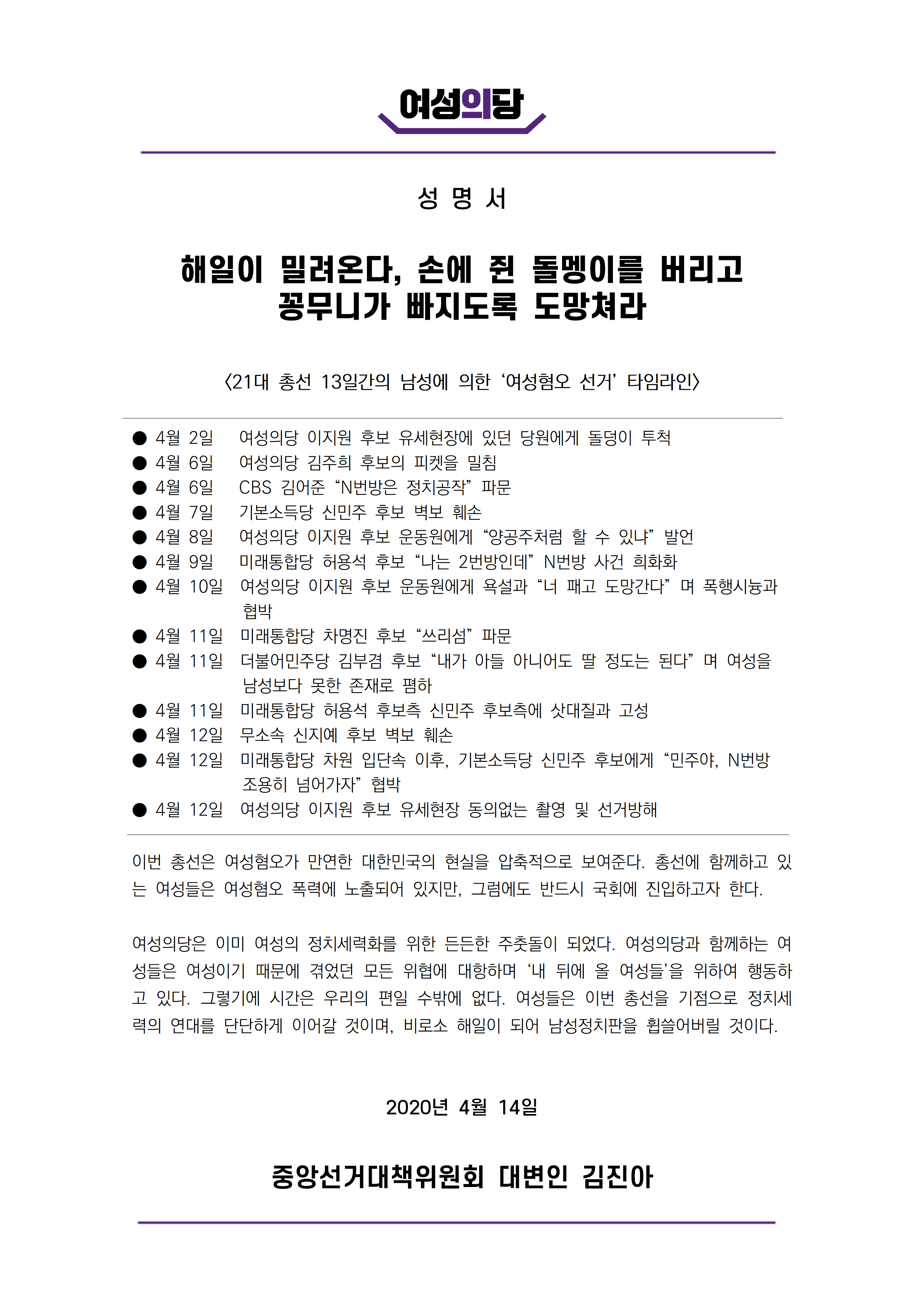![]() 성 명 서 해일이 밀려온다, 손에 쥔 돌멩이를 버리고 꽁무니가 빠지도록 도망쳐라 <21대 총선 13일간의 남성에 의한 ‘여성혐오 선거’ 타임라인> ● 4월 2일 여성의당 이지원 후보 유세현장에 있던 당원에게 돌덩이 투척 ● 4월 6일 여성의당 김주희 후보의 피켓을 밀침 ● 4월 6일 CBS 김어준 “N번방은 정치공작” 파문 ● 4월 7일 기본소득당 신민주 후보 벽보 훼손 ● 4월 8일 여성의당 이지원 후보 운동원에게 “양공주처럼 할 수 있냐” 발언 ● 4월 9일 미래통합당 허용석 후보 “나는 2번방인데” N번방 사건 희화화 ● 4월 10일 여성의당 이지원 후보 운동원에게 욕설과 “너 패고 도망간다” 며 폭행시늉과 협박 ● 4월 11일 미래통합당 차명진 후보 “쓰리섬” 파문 ● 4월 11일 더불어민주당 김부겸 후보 “내가 아들 아니어도 딸 정도는 된다” 며 여성을 남성보다 못한 존재로 폄하 ● 4월 11일 미래통합당 허용석 후보측 신민주 후보측에 삿대질과 고성 ● 4월 12일 무소속 신지예 후보 벽보 훼손 ● 4월 12일 미래통합당 차원 입단속 이후, 기본소득당 신민주 후보에게 “민주야, N번방 조용히 넘어가자” 협박 ● 4월 12일 여성의당 이지원 후보 유세현장 동의없는 촬영 및 선거방해 이번 총선은 여성혐오가 만연한 대한민국의 현실을 압축적으로 보여준다. 총선에 함께하고 있는 여성들은 여성혐오 폭력에 노출되어 있지만, 그럼에도 반드시 국회에 진입하고자 한다. 여성의당은 이미 여성의 정치세력화를 위한 든든한 주춧돌이 되었다. 여성의당과 함께하는 여성들은 여성이기 때문에 겪었던 모든 위협에 대항하며 ‘내 뒤에 올 여성들’을 위하여 행동하고 있다. 그렇기에 시간은 우리의 편일 수밖에 없다. 여성들은 이번 총선을 기점으로 정치세력의 연대를 단단하게 이어갈 것이며, 비로소 해일이 되어 남성정치판을 휩쓸어버릴 것이다. 2020년 4월 14일