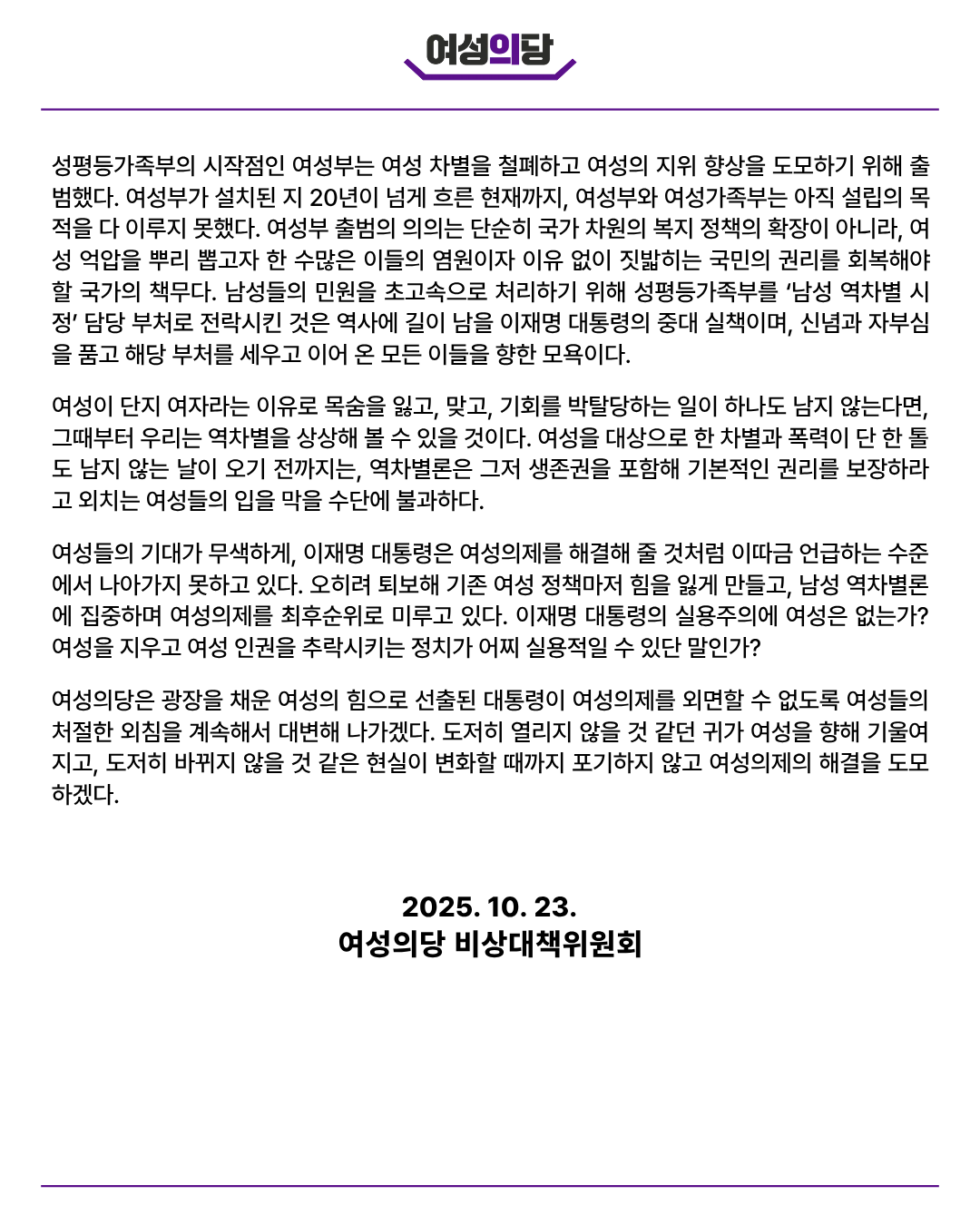 ![]() ![]() ‘남성 역차별 해소’를 담당하는 것으로 알려진 성형평성기획과가 기어코 성평등정책관(구 여성정책국)의 주무과 자리를 꿰찼다. 기존 여성정책국의 주무과였던 여성정책과는 성평등정책과로 이름이 바뀌며 주무과에서 밀려났다. 고용평등정책관의 주무과는 고용평등총괄과이고, 청소년정책관의 주무과는 청소년정책과이지만, 성평등정책관의 주무과는 ‘성평등정책’과가 아닌 성형평성기획과가 맡게 되었다. 여성가족부에서 성평등가족부로 이름을 바꾼 뒤, 해당 부처 내 조직에서는 ‘여성’이라는 글자가 모두 사라졌다. 이는 우연이 아니라 취임 이후 무려 세 번이나 ‘남성 역차별 해소’를 주문해 온 이재명 대통령의 의지를 반영한 결과다. 성평등가족부는 출범 첫날 성평등정책실 신설과 직원 17명 증원을 알리며 성평등 정책을 종합적으로 추진하겠다고 밝혔으나, 행보를 종합해 보면 부처 확대 운영의 목표는 ‘여성들에게 괜히 미움받아’ 억울한 남성들을 보듬고 달래주는 것에 가깝다. 이재명 대통령이 청년 남성의 기분을 풀어주는 데 골몰하는 동안, 여성들은 실존하는 폭력과 차별에 목숨을 잃고 있다. 최근 재차 수면 위에 떠오른 불법촬영·성착취물 사이트를 비롯해, 여성의 일상은 매분 매초 끝없는 위협으로 점철되어 있다. 폭력과 차별 없이 그저 평범한 일상을 얻어내기 위해 한없이 분투해야만 한다는 좌절감 속에서도, 수많은 여성은 이재명 대통령이 여성에게 더 나은 세상을 만들어 줄 것이라고 믿으며 그를 선출권력의 정점에 올려주었다. 그러나 대통령은 여성들이 위임한 권력을 손에 쥐고 여성을 배반했다. 이전 정부와 여성혐오 실적을 두고 경쟁이라도 하듯 여성의 안전과 권리를 지탱하는 기반을 급속도로 무너뜨렸으며, 대통령 취임 후 약 반년을 앞둔 현재 대한민국의 여성 인권은 명백히 후퇴하고 있다. 성평등가족부의 시작점인 여성부는 여성 차별을 철폐하고 여성의 지위 향상을 도모하기 위해 출범했다. 여성부가 설치된 지 20년이 넘게 흐른 현재까지, 여성부와 여성가족부는 아직 설립의 목적을 다 이루지 못했다. 여성부 출범의 의의는 단순히 국가 차원의 복지 정책의 확장이 아니라, 여성 억압을 뿌리 뽑고자 한 수많은 이들의 염원이자 이유 없이 짓밟히는 국민의 권리를 회복해야 할 국가의 책무다. 남성들의 민원을 초고속으로 처리하기 위해 성평등가족부를 ‘남성 역차별 시정’ 담당 부처로 전락시킨 것은 역사에 길이 남을 이재명 대통령의 중대 실책이며, 신념과 자부심을 품고 해당 부처를 세우고 이어 온 모든 이들을 향한 모욕이다. 여성이 단지 여자라는 이유로 목숨을 잃고, 맞고, 기회를 박탈당하는 일이 하나도 남지 않는다면, 그때부터 우리는 역차별을 상상해 볼 수 있을 것이다. 여성을 대상으로 한 차별과 폭력이 단 한 톨도 남지 않는 날이 오기 전까지는, 역차별론은 그저 생존권을 포함해 기본적인 권리를 보장하라고 외치는 여성들의 입을 막을 수단에 불과하다. 여성들의 기대가 무색하게, 이재명 대통령은 여성의제를 해결해 줄 것처럼 이따금 언급하는 수준에서 나아가지 못하고 있다. 오히려 퇴보해 기존 여성 정책마저 힘을 잃게 만들고, 남성 역차별론에 집중하며 여성의제를 최후순위로 미루고 있다. 이재명 대통령의 실용주의에 여성은 없는가? 여성을 지우고 여성 인권을 추락시키는 정치가 어찌 실용적일 수 있단 말인가? 여성의당은 광장을 채운 여성의 힘으로 선출된 대통령이 여성의제를 외면할 수 없도록 여성들의 처절한 외침을 계속해서 대변해 나가겠다. 도저히 열리지 않을 것 같던 귀가 여성을 향해 기울여지고, 도저히 바뀌지 않을 것 같은 현실이 변화할 때까지 포기하지 않고 여성의제의 해결을 도모하겠다. 2025. 10. 23. |