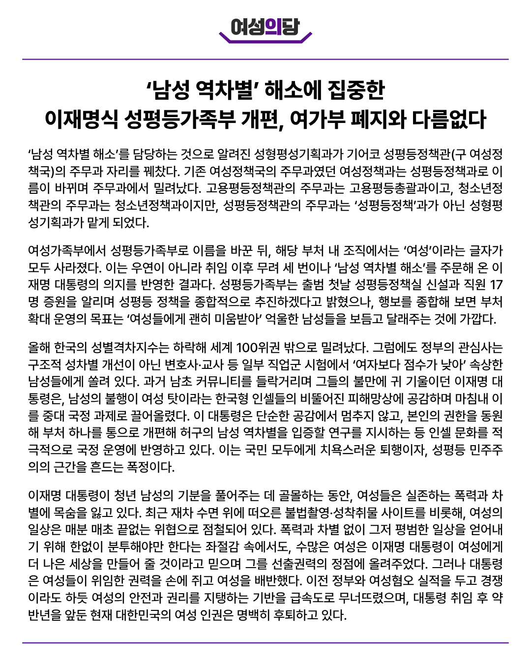 ‘남성 역차별’ 해소에 집중한 이재명식 성평등가족부 개편, 여가부 폐지와 다름없다 | |