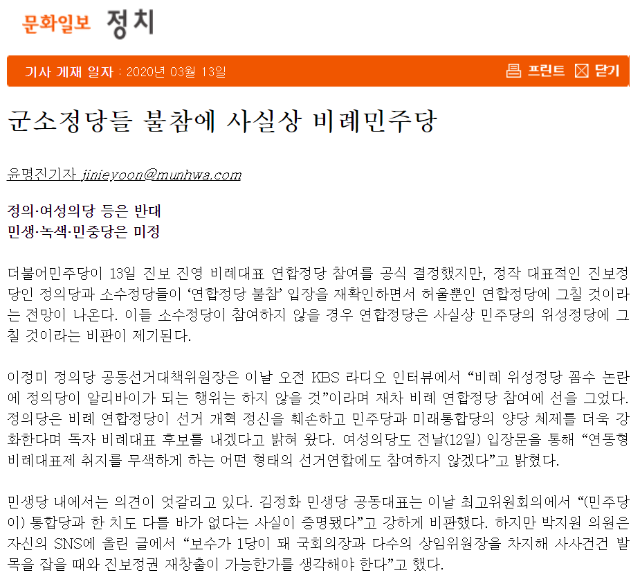 2020.03.13 문화일보 > 정치> 군소정당들 불참에 사실상 비례민주당