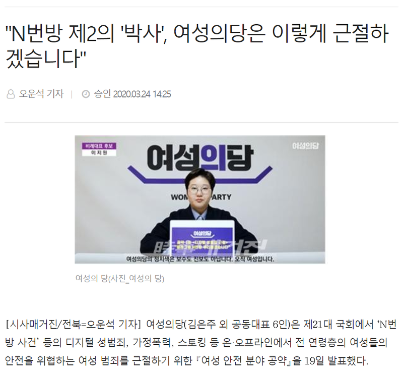 2020.03.24 시사매거진 > 전국 > 전북 "N번방 제2의 '박사', 여성의당은 이렇게 근절하겠습니다" http://www.sisamagazine.co.kr/news/articleView.html?idxno=316186