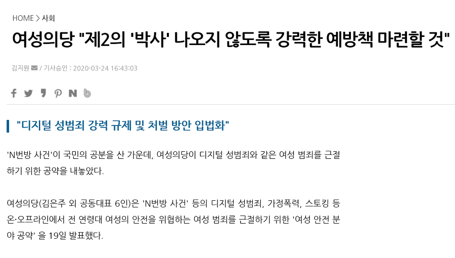 2020.03.24 UPI뉴스 > 사회 > 여성의당 "제2의 '박사' 나오지 않도록 강력한 예방책 마련할 것“ http://www.upinews.kr/newsView/upi202003240106