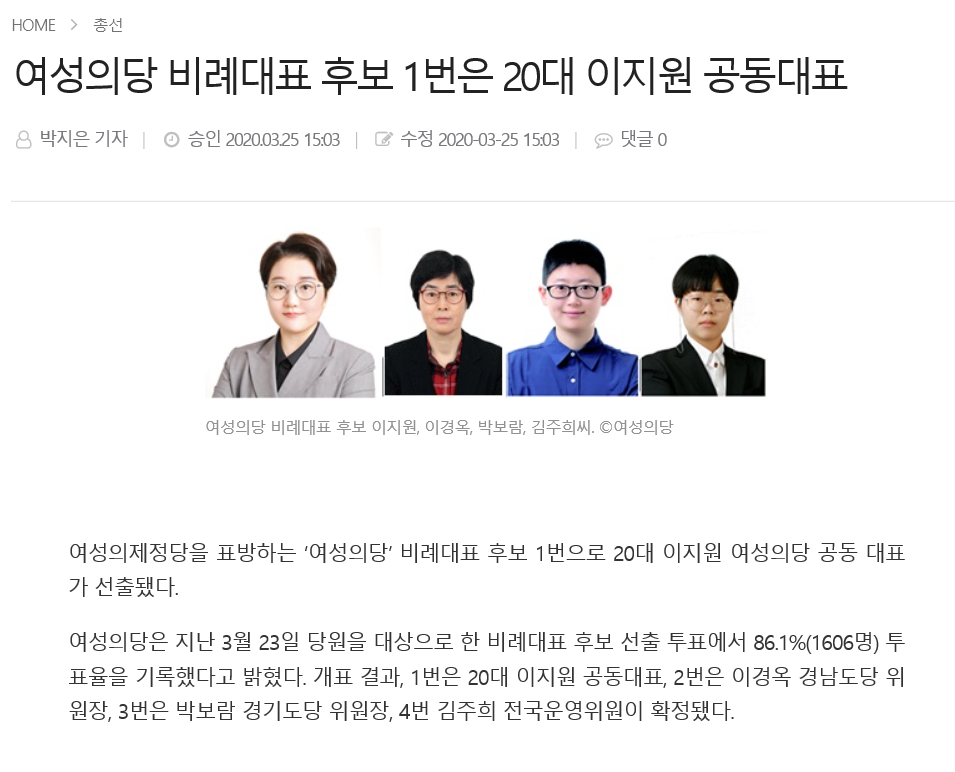 2020.03.25 여성신문 > 총선 > 여성의당 비례대표 후보 1번은 20대 이지원 공동대표