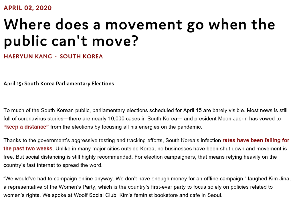 2020.04.02 > THE BALLOT > Where does a movement go when the public can't move? https://www.theballot.world/articles/keyboard-warriors-for-womens-rights-gwn57