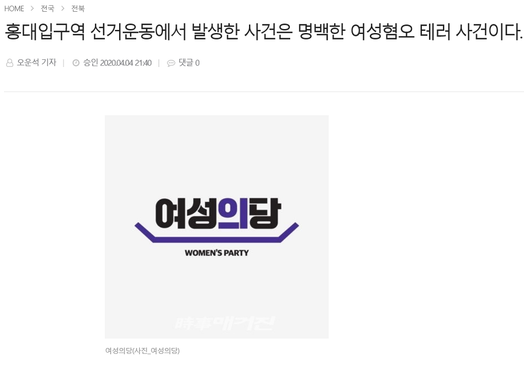 2020.04.04 > 시사매거진 > 전국 > 전북 > 홍대입구역 선거운동에서 발생한 사건은 명백한 여성혐오 테러 사건이다. http://www.sisamagazine.co.kr/news/articleView.html?idxno=317219
