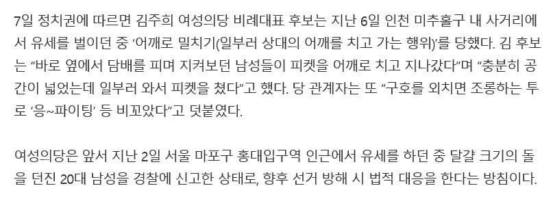 | [이데일리]'돌 던지고 어깨빵'…선거 유세 방해 잇따라 | |