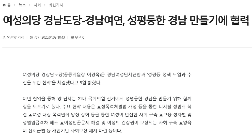| [CNN21]여성의당 경남도당-경남여연, 성평등한 경남 만들기에 협력 | |