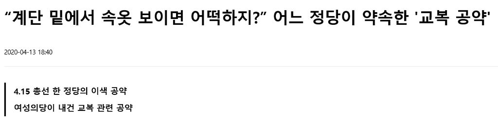 2020.04.13 > 위키트리 > 정치 > “계단 밑에서 속옷 보이면 어떡하지?” 어느 정당이 약속한 '교복 공약' https://www.wikitree.co.kr/articles/523179 |