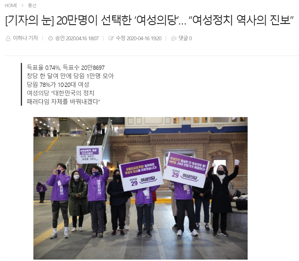 2020.04.16 > 여성신문 > 총선 > [기자의 눈] 20만명이 선택한 ‘여성의당’… “여성정치 역사의 진보” http://www.womennews.co.kr/news/articleView.html?idxno=19827 |