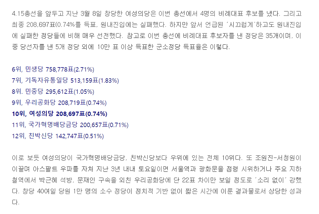 | [신문고뉴스]4.15 총선 또 다른 관전 포인트...여성의당 '조용한' 약진 | |
