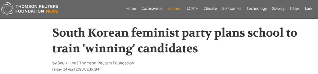 2020.04.24 > Thomson Reuters Foundation > Women > South Korean feminist party plans school to train 'winning' candidates https://news.trust.org/item/20200424075519-quy31 |