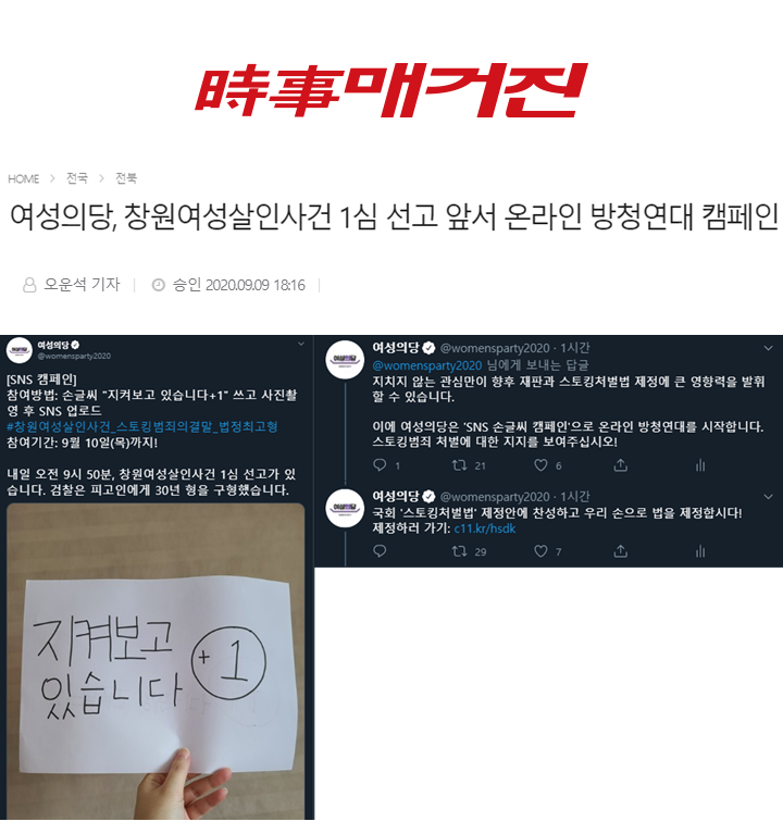 | [시사매거진] 여성의당, 창원여성살인사건 1심 선고 앞서 온라인 방청연대 캠페인 | |