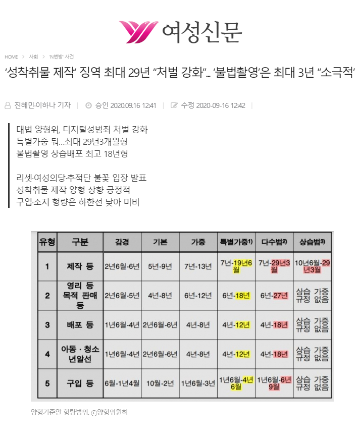 | [여성신문] ‘성착취물 제작’ 징역 최대 29년 “처벌 강화”... ‘불법촬영’은 최대 3년 “소극적” | |