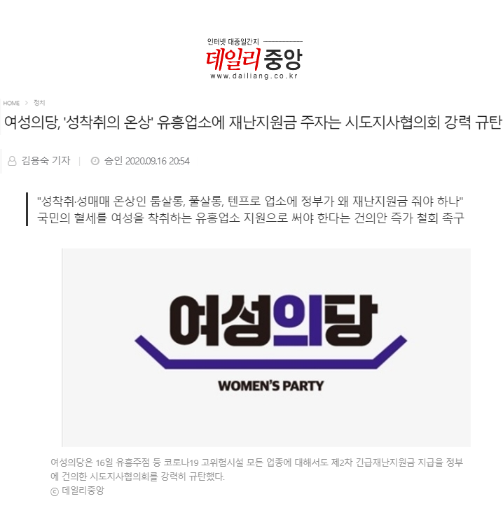 | [데일리중앙] 여성의당, '성착취의 온상' 유흥업소에 재난지원금 주자는 시도지사협의회 강력 규탄 | |