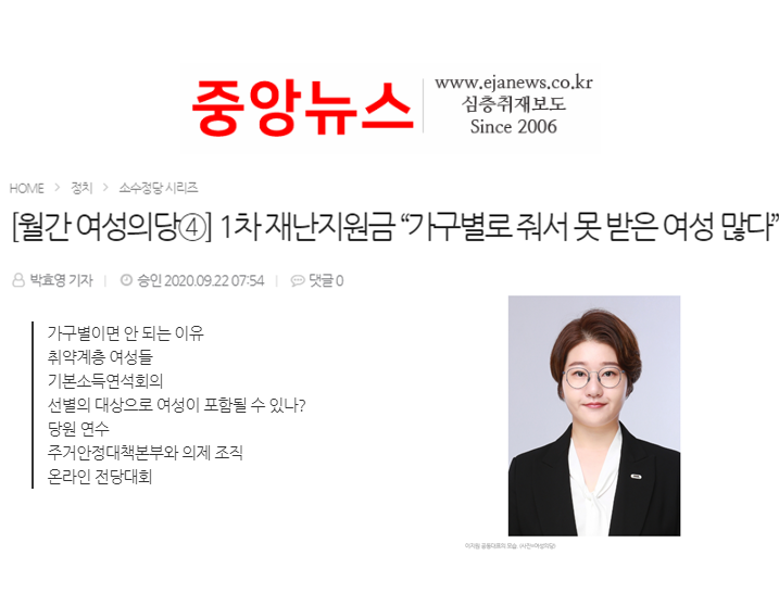 | [중앙뉴스] [월간 여성의당④] 1차 재난지원금 “가구별로 줘서 못 받은 여성 많다” | |