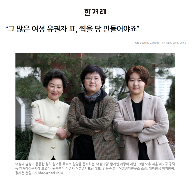 | [한겨레] “그 많은 여성 유권자 표, 찍을 당 만들어야죠” | |