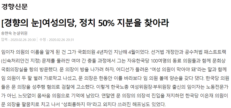 경향신문 > 오피니언 > 칼럼 2020.02.26 "여성의당, 정치 50%의 지분을 찾아라 http://news.khan.co.kr/kh_news/khan_art_view.html?artid=202002262030015&code=990503