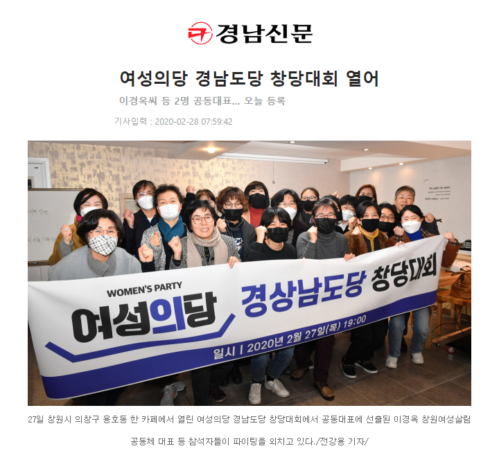 2020.02.28. 경남신문 > 정치 > 여성의당 경남도당 창당대회 열어 http://www.knnews.co.kr/news/articleView.php?idxno=1320469