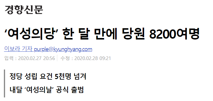 2020.02.28. 경향신문 > 사회일반 '여성의당' 한 달 만에 당원 8,200 여 명 http://news.khan.co.kr/kh_news/khan_art_view.html?artid=202002272056035&code=940100